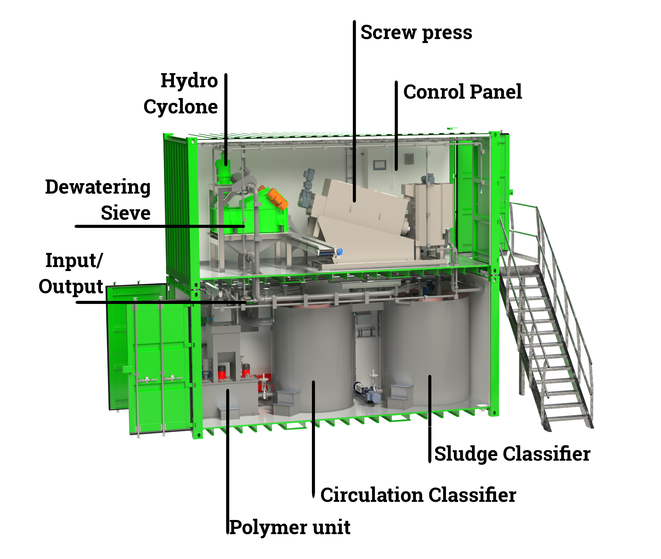 Het bezonken zand wordt naar de zandscheiding gepompt. Hier worden vaste deeltjes tot 25 micron gescheiden door middel van hydrocyclonen.
