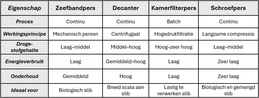 Er bestaan verschillende technieken ten behoeve van slibontwatering, elk met specifieke voordelen. Hieronder beschrijven we de zeefbandpers, decanter centrifuge, kamerfilterpers en schroefpers – en wanneer welke technologie het meest geschikt is.