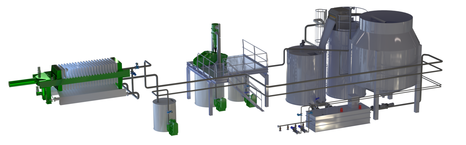 Elke WWT100-lijn wordt ontworpen op basis van de gewenste processtroom, de beschikbare ruimte en de specifieke bedrijfsvoering van de klant. Indien nodig kunnen meerdere lijnen worden gecombineerd voor zeer hoge productiecapaciteiten.